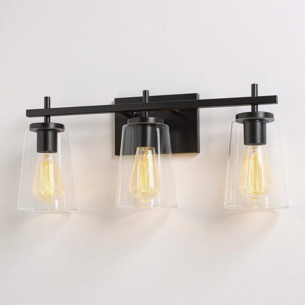 Contemporary vanity. Clear glass diffuser with black finish or white glass diffuser with satin nickel finish. Medium base sockets with 60W Max lamps (not included)