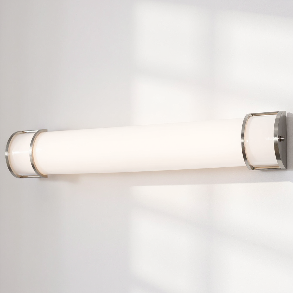 Contemporary half round LED vanity with metal ends and accent rings. White acrylic diffuser disperses the light evenly. Horizontal or vertical mounting. Available in three lengths.