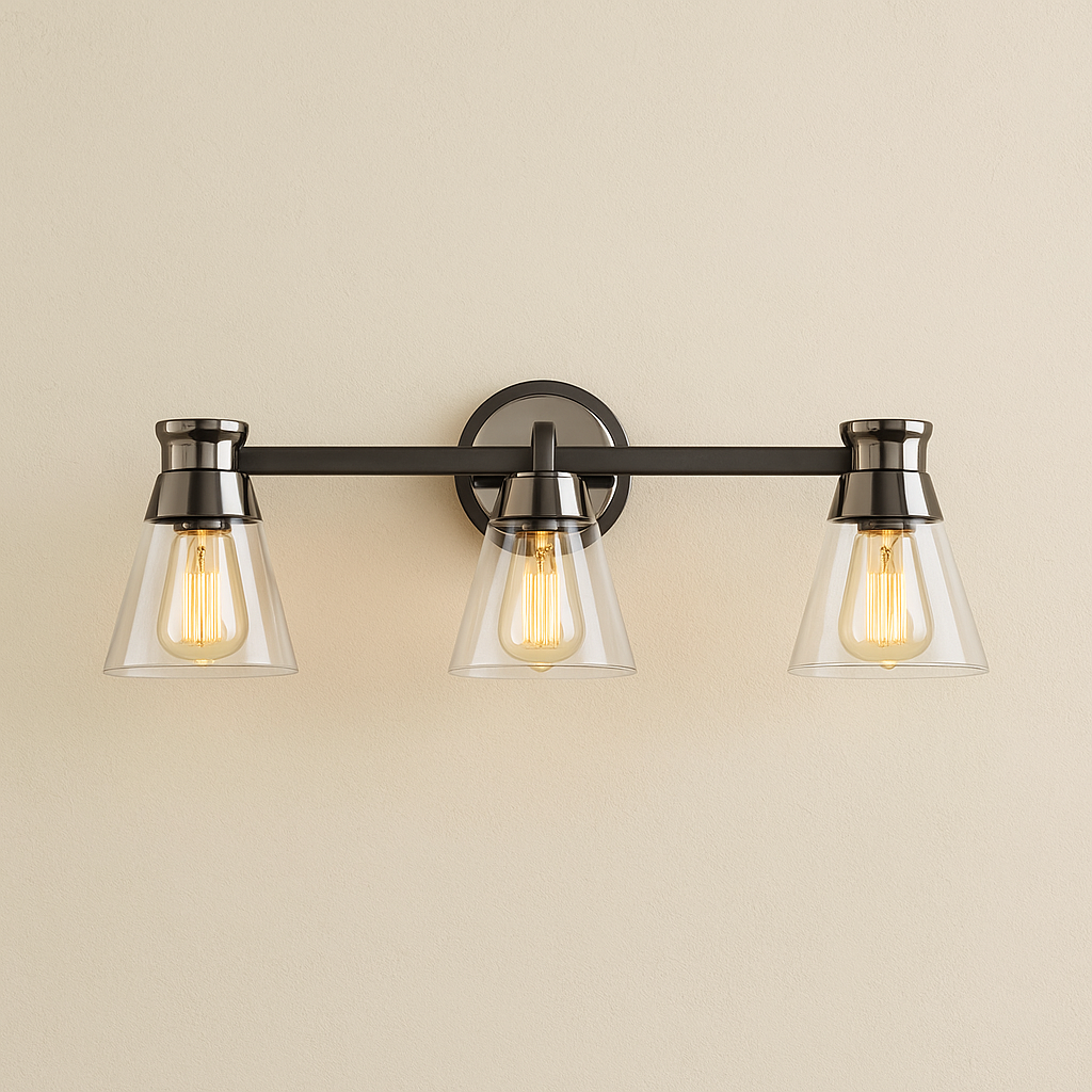 The Kanata collection by designer Kevin Kraemer is unique, stylish and soft. This collection features clear tapered glassware that is held by thin arms that wrap around the cups to finish off the design. The matte black cups are complimented with a smooth brass finish on the arm banding. 3 light version shown - single and four light versions also available. (Alternate colour option available - Polished nickel and black)