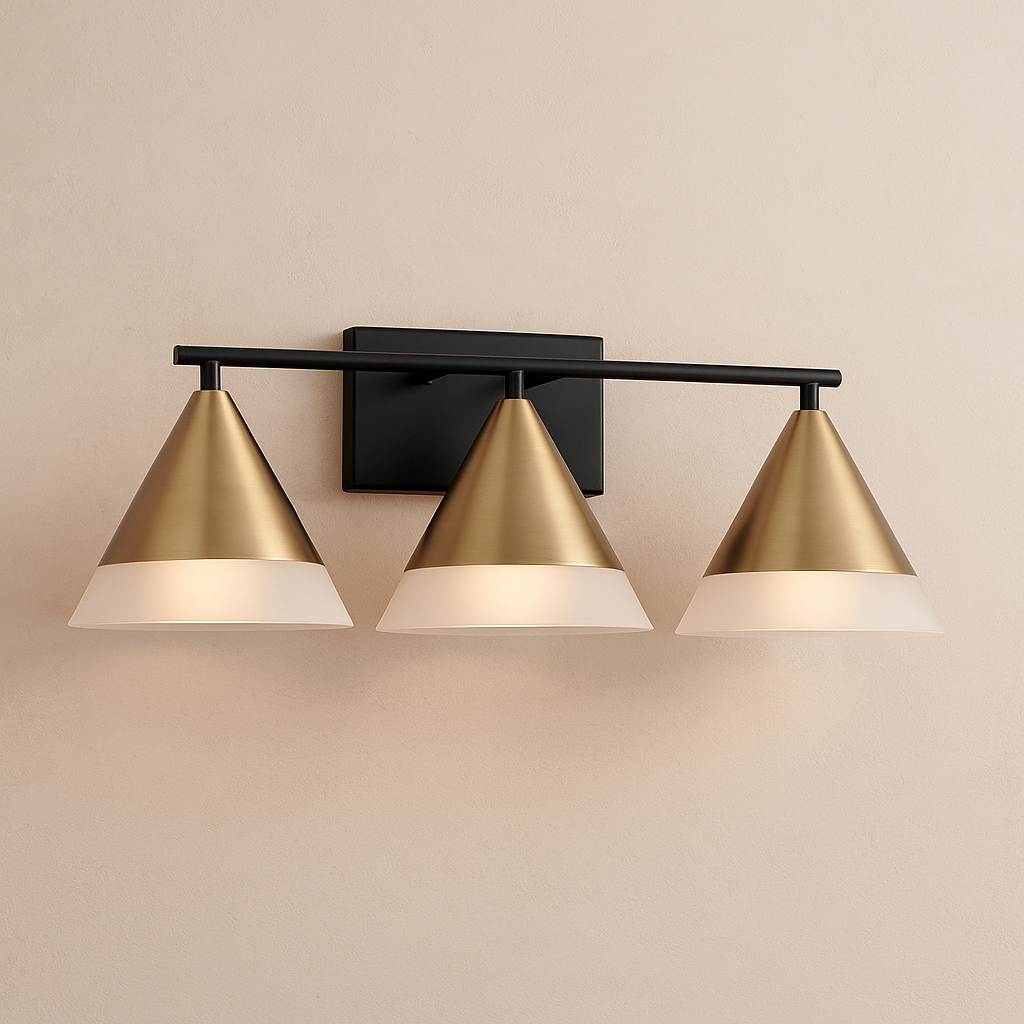 Create striking elegance in any powder room with the Avant 3-Light Vanity. The pointed Aged Brass metal shades widen to slightly translucent Frosted Glass to create an all-around stunning glow. Finished with Matte Black details, this luminaire evokes a distinct style.