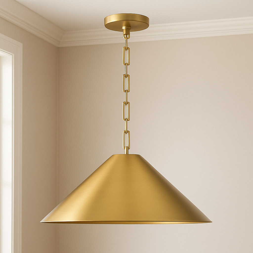 Both simple and stunning, the 20 Avery Medium Pendant brings captivating style to any space. The brushed Aged Brass finish adds dimension to the inch wide cone shape, while the unique rectangular decorative chain delivers high design detail.