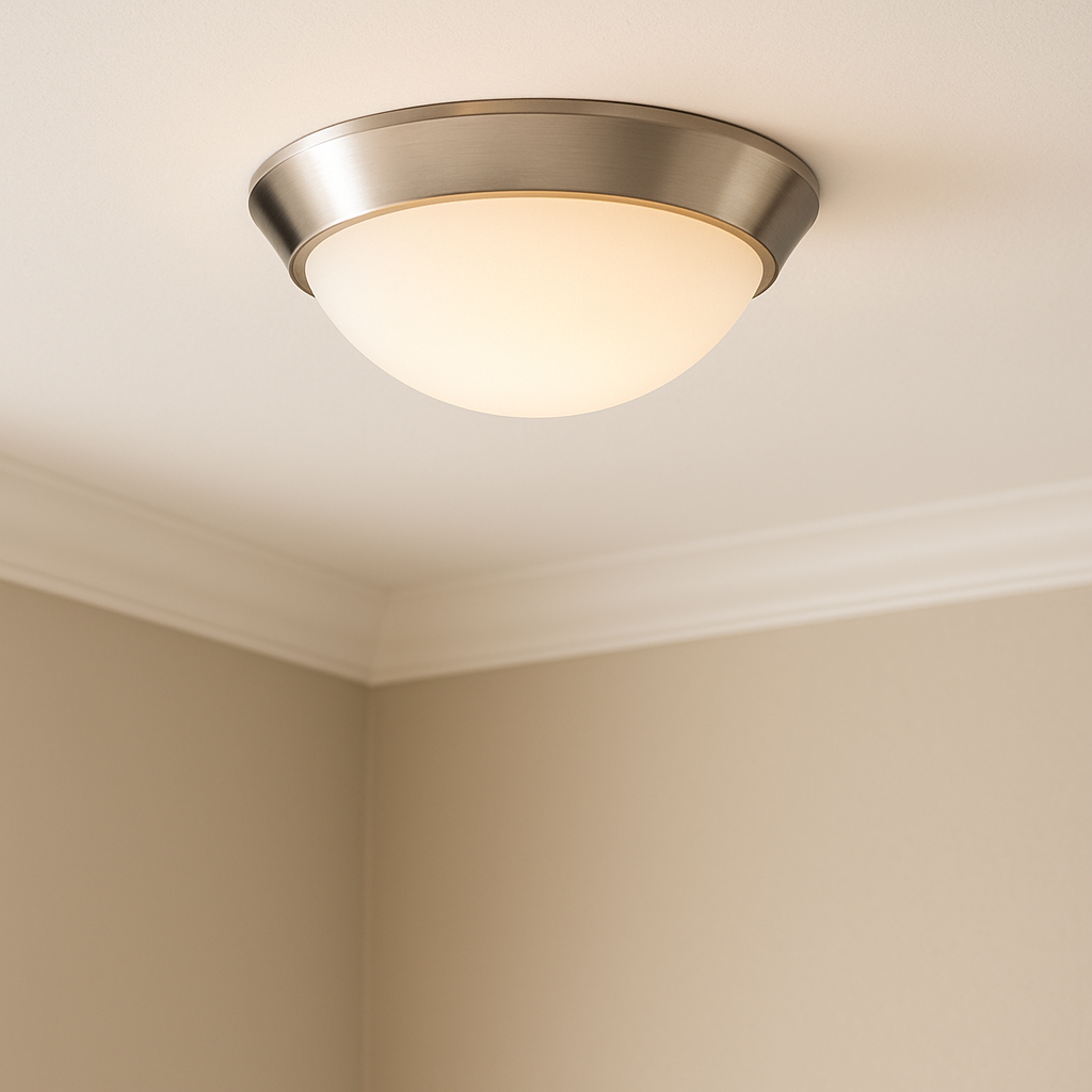 The simplicity of this flush mount fixture makes it an easy match for any d?cor. It features a 10in. diameter, Brushed Nickel finish, Satin-etched cased opal twist-on glass, and 1-light design that uses a 75-watt (max.) bulb. It is U.L. listed for damp applications.