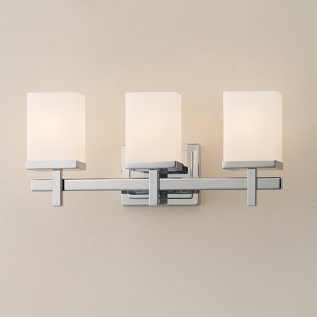 Square glass shades ride upon a rectangular bar to create geometry at its best. Available in Polished Chrome with Satin White glass and Satin Nickel and white Linen glass.