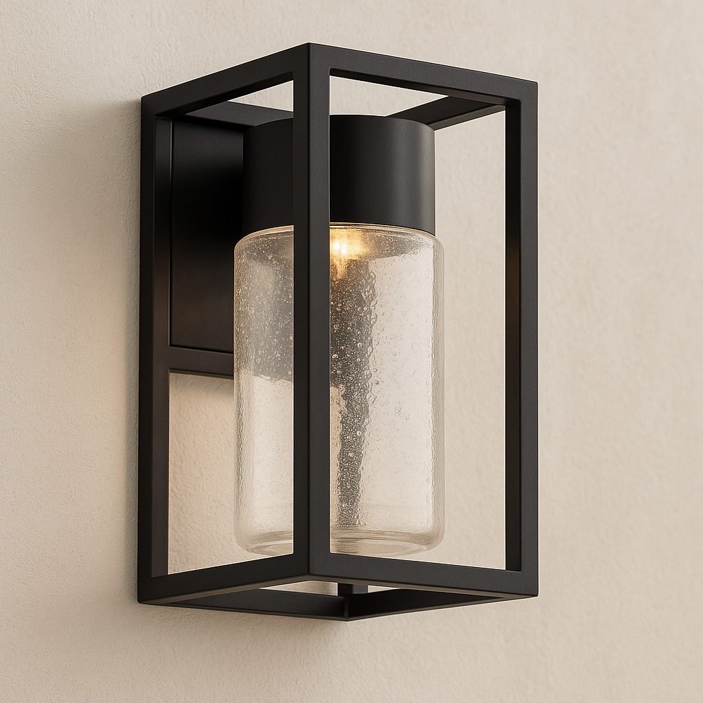A refreshing look for refined tastes. A raindrop glass cylinder suspended within in an architectural frame. Beautifully illuminated with LED down lighting for a magical appearance of crystallized effervescence. Dark sky orientation preserves observation of star filled skies.