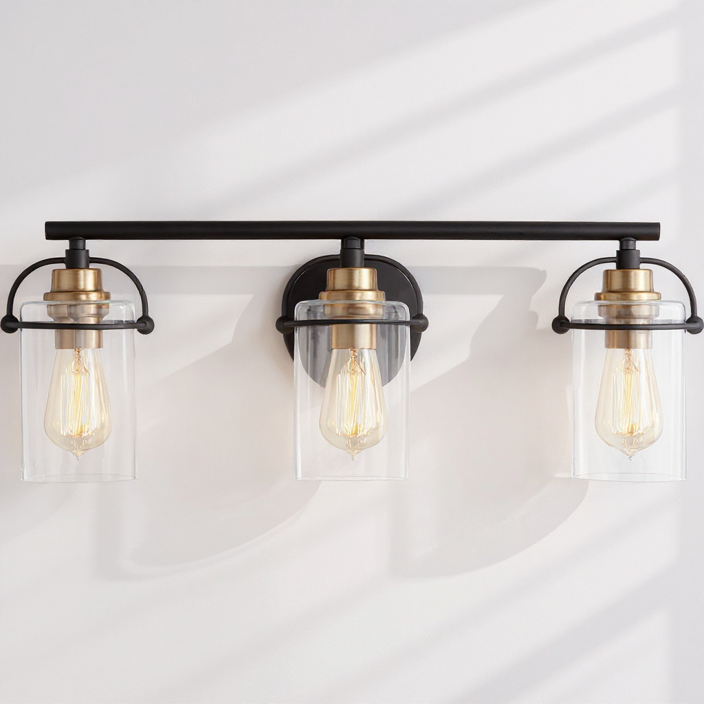 Emerson's transitional silhouette charms with unique harness-style brackets and simple clear glass shades. These bath vanity lights are available in multiple sizes and either a Brushed Nickel or a Matte Black finish. The Brushed Nickel finish boasts a classic simplicity while the Matte Black finish gives way for a more industrial feel with its use of mixed metals. Whichever option you choose, you can't go wrong with Emerson.