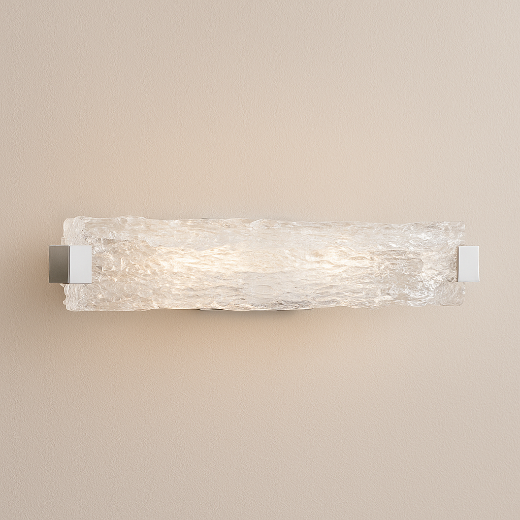 Inspired by delicate sheets of ice, the Winter collection is intense and dramatic. The integrated LED technology runs across the full length of the fixture, showcasing the unique crackling effect of the glass. Keeping with the contemporary style, the backplate and side brackets are finished in a glossy polished chrome.