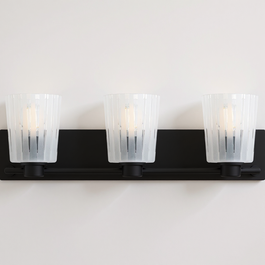 The Gray lighting collection offers a striking blend of transitional design and classic charm. The clear glass shades are characterized by distinct vertical ribs that create an intriguing interplay of light and shadow. Etched patterns in between the ribs further the visual effect of the unique shades. The matte black finish of the metal frame provides a sleek contrast to the textured glass. Gray is available as a mini pendant light, semi-flush mount, or in various sizes of bath light.
